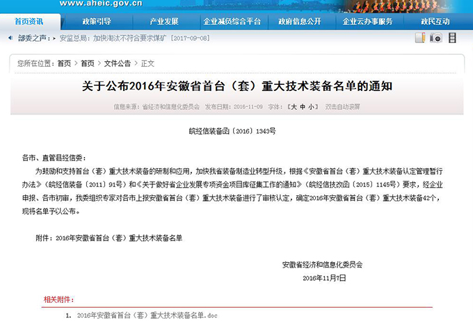 Successful case: the company developed the "ZY10000 / 24 / 50D electro-hydraulic control bracket" was named 2016 "Anhui Province (Taiwan) sets of major equipment"